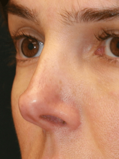This patient suffered from the unfortunate consequences of an old fashion poorly performed rhinoplasty. It was done through a closed technique which limits a surgeon's ability to see the delicate cartilages of the nose that define the nasal tip and middle vault in a binocular fashion. In other words, the surgeon cannot compare the left cartlilage with the right while performing suturing which is supposed to be as exact as possible. He or she may think they performed an exact symmetrical maneuver whereas, in fact, a subtle asymmetry of half a millimeter was left behind. This often may have an aesthetic consequence which only becomes apparent several months after the closed rhinoplasty, when enough swelling has dissipated, allowing the asymmetrical irregularity to emerge.