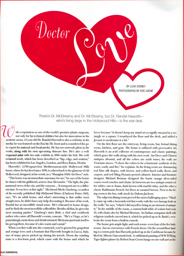 With a reputation as one of the world’s premier plastic surgeons, not only for his technical abilities but also for innovations in the aesthetic arena, 45 year old Dr. Randal Haworth is also a celebrity in the media: he was featured on the Fox hit The Swan and is considered the go-to expert for national and local media. He has two network pilots in the works, along with his own upcoming skincare line. He’s also a well-respected artist with two solo exhibits in 2006 under his belt. His well-reviewed work, which has been described as “hip, edgy, and sentient,: has been exhibited in Los Angeles, London, and Boca Raton, Florida.